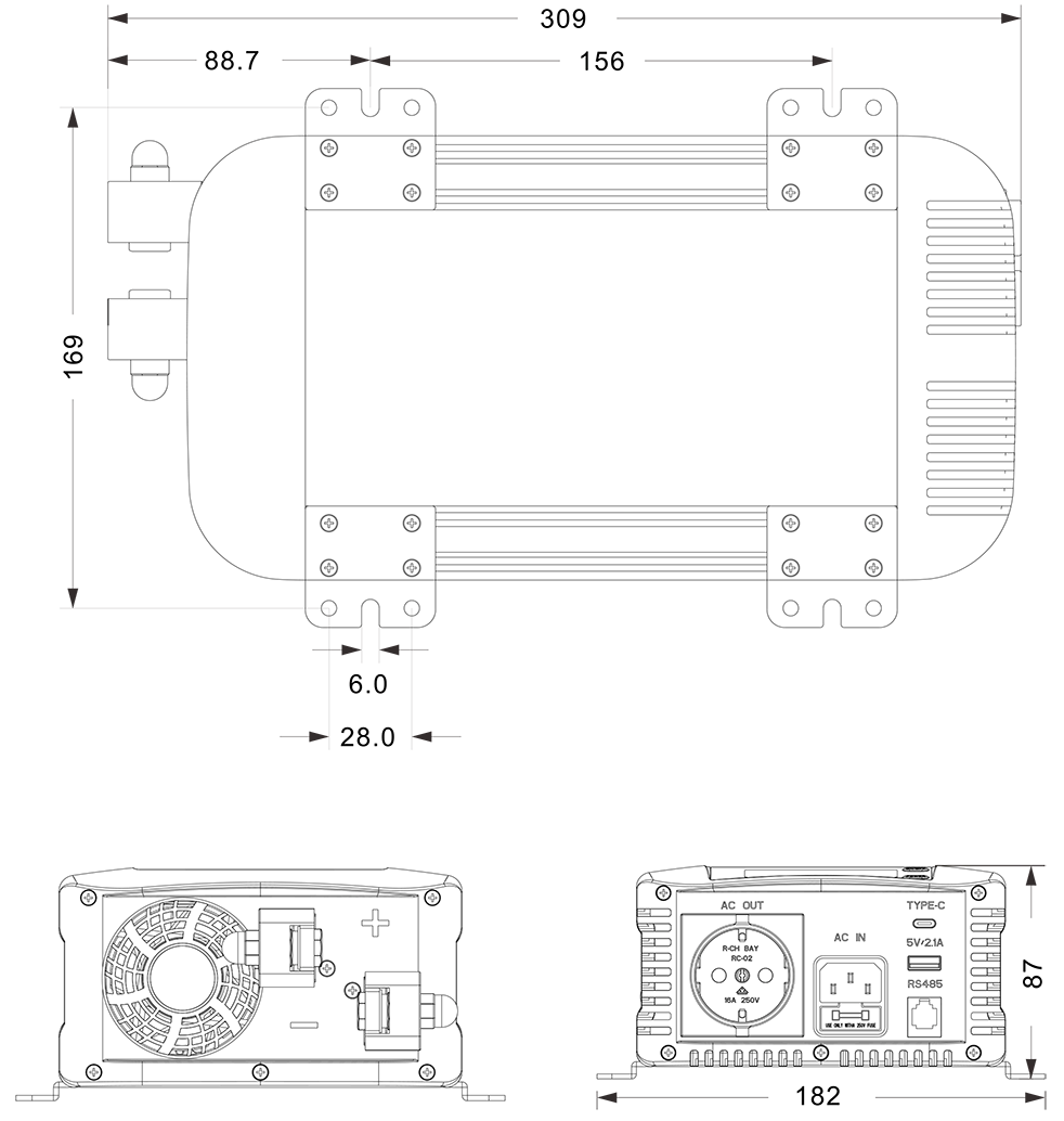 Превключвател за прехвърляне Стандартен ATS: Инвертор към електрическа мрежа AC: 8~10ms.; Електрическа мрежа към инвертор: 16~25ms.