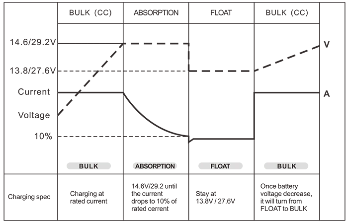 Контрол на батерията (3-степенни зарядни устройства за батерии) Насипно състояние / Абсорбция / Поплавък