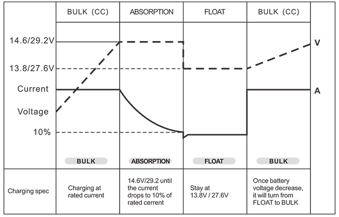 Контрол на батерията (3-степенни зарядни устройства за батерии) Насипно състояние / Абсорбция / Поплавък